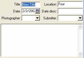 Only the properties you change will be edited for all the pictures. Finally, press the Save Button To recap, let's say you have a hundred or so pictures to add to Family Photo Buddy. Editing each picture one by one is out of the question! Usually you are adding these pictures to a category, so you might want to add that first. Add the first picture, assign it to a new Category, and display this Category. Now all the pictures you add will be added to the correct category automatically. (see Categories for more) Add all the pictures (see Adding pictures for more). After you have added them all, Select All of them, and edit the Location, Date, Photographer, etc.