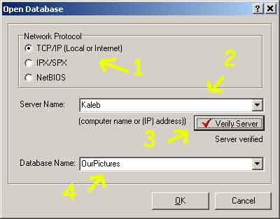 choose Open Server Database... from the File menu. A window like below opens. 1) Select the network protocol. For example, use TPC/IP for Internet connections. 2) Type in the Server Name or (IP) address of the server computer you are connecting to. 3) Click the Verify Server button which will try to open the server. If all is well, you will get a 'Server verified' message. Otherwise you'll get an error message. 4) After the server is verified, you will see a list of databases on that server. Choose one in the Database Name list and click OK to open it.